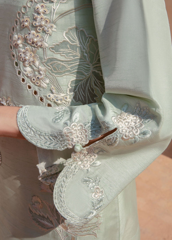 Additional Description: A dazzling pastels jade ensemble with spectacular accents and flesh out floral craftsmanship. Perfect for effortless grace and traditional splendor. Shirt Length: 54 Pants Length: 37 Fabric Details: Korean Raw Silk
